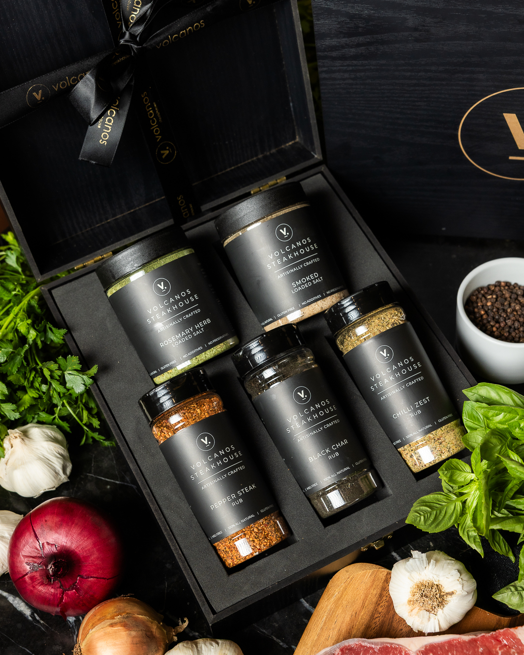 COMING SOON!! Volcanos Loaded Salts, Rubs, Chip Dusts and Butter mixes are hand crafted small batch seasonings produced in Australia from local and imported ingredients. Enjoy a custom selection in our gift box with 5 choices. Once chosen, your 5 selections are then packed into our beautiful gift box and shipped Australia wide, or you can choose a store pickup from your local Volcanos restaurant.